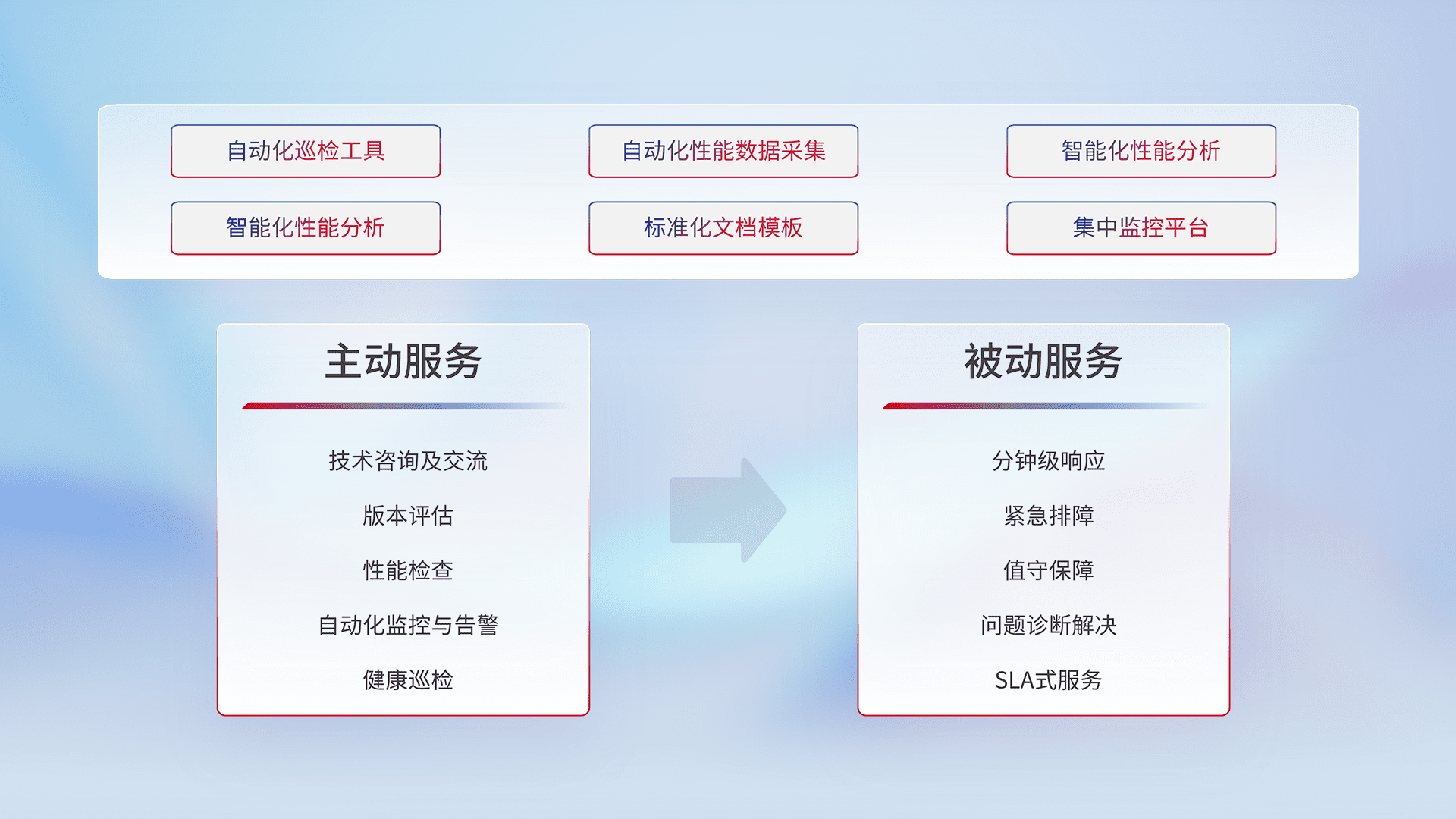 智能化工具和标准化文档,,保障服务质量,,提供主动服务(包含技术咨询、、、版本评估、、、、性能检查、、自动化监控与告警、、、健康巡检)和被动服务包含(分钟级响应、、紧急排障、、、、值守保障、、、问题诊断解决、、、、SLA服务)。。。